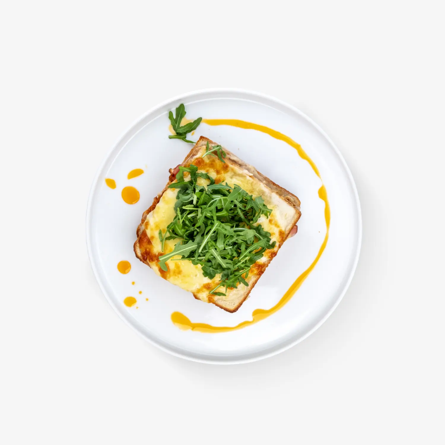trzy jajka w koszulce na toście / bekon / rukola / sos holenderski / szczypiorek