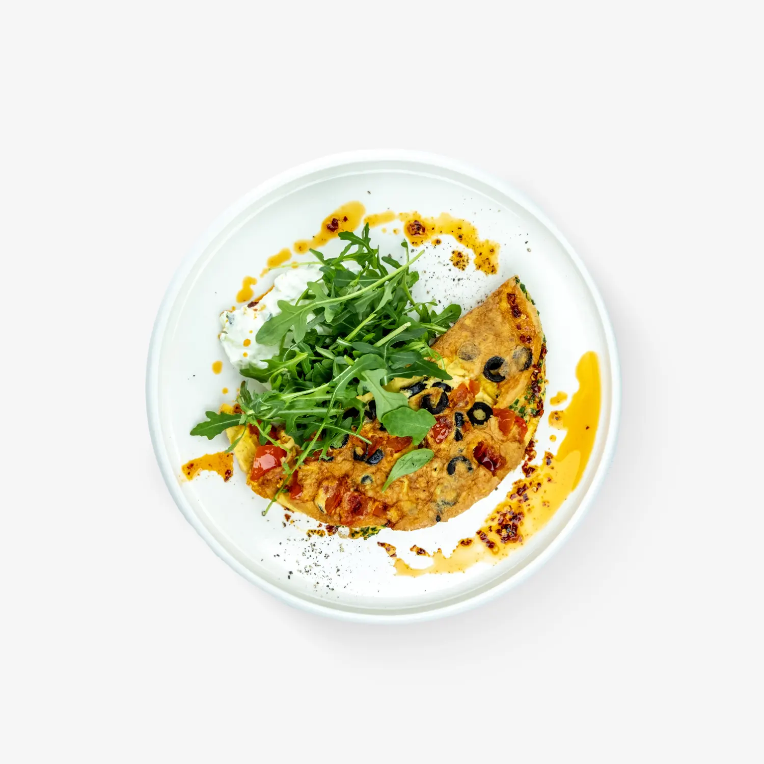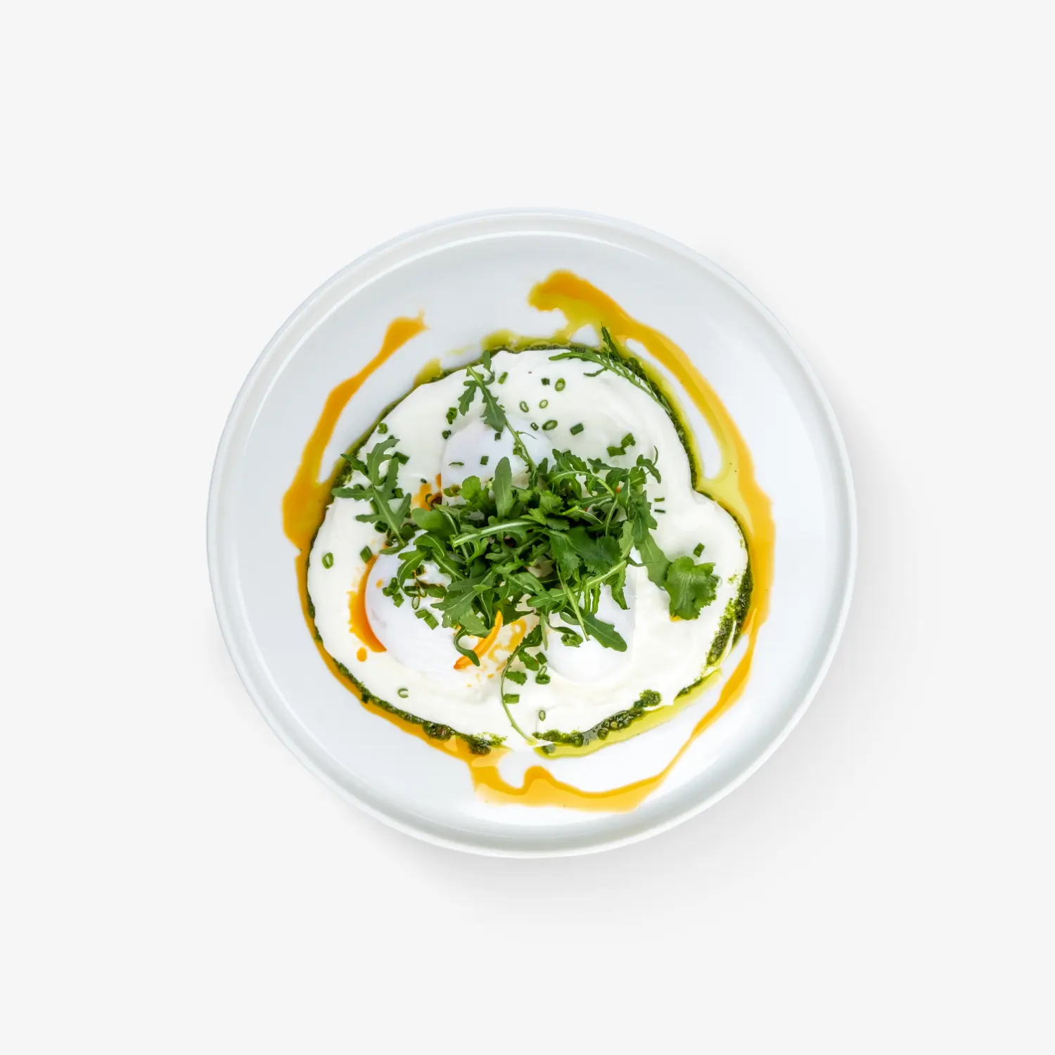 trzy jajka w koszulce / ser labneh / oliwa z harissą / pesto z rukoli / szczypiorek / kolendra / pieczywo